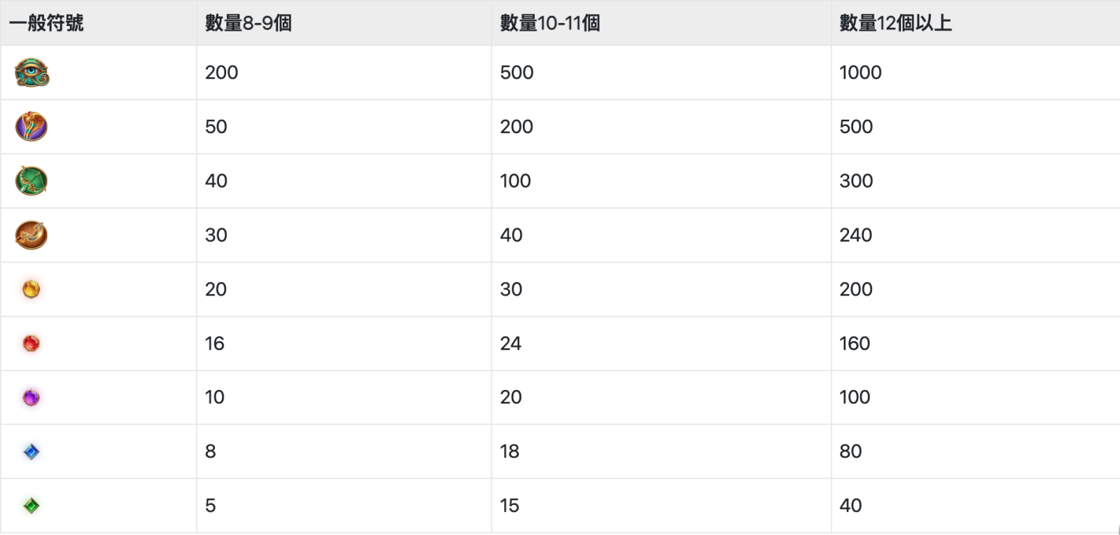 - ∙ 消除符號即可獲得贏分,依照賠率表計算:贏分=(單次押注額/20)x符號賠率。