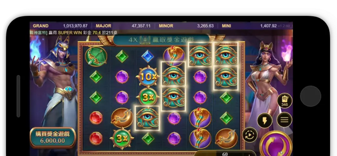 在《戰神賽特》中,玩家可以選擇支付當前押注的100倍來直接購買免費遊戲,無需等待自然觸發。這種機制提供了更多彈性和控制遊戲的機會給玩家。